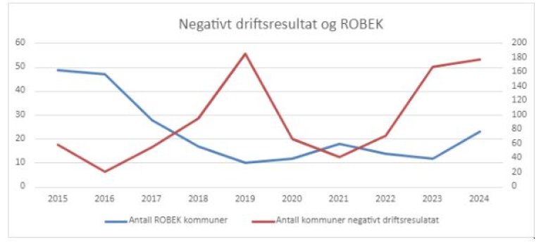 De 63 kommunene som hadde negativt driftsresultat i 2022 står nå i fare for å bli meldt inn i ROBEK i 2025. Dersom denne trenden fortsetter, kan vi forvente følgende utvikling: